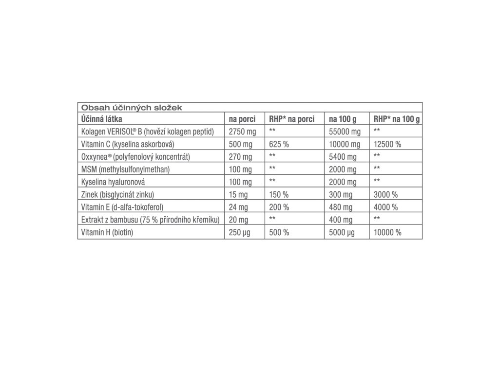 Složení: KOLAGEN VERISOL® B (HOVĚZÍ KOLAGEN PEPTID), VITAMIN C (KYSELINA ASKORBOVÁ), AROMATA, ČEKANKOVÁ VLÁKNINA, OXXYNEA® (POLYFENOLOVÝ KONCENTRÁT), REGULÁTOR KYSELOSTI: KYSELINA CITRONOVÁ, BARVIVO ČERVENÁ ŘEPA, MSM (METHYLSULFONYLMETHAN), KYSELINA HYALURONOVÁ, SLADIDLO: STEVIOL-GLYKOSIDY; BISGLYCINÁT ZINKU, VITAMIN E (D-ALFA-TOKOFEROL), EXTRAKT Z BAMBUSU (75 % PŘÍRODNÍHO KŘEMÍKU), VITAMIN H (BIOTIN)