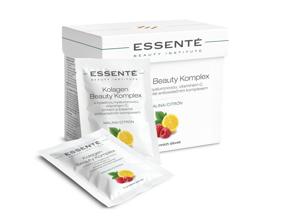 ESSENTÉ Kolagen Beauty Komplex je prémiový doplněk stravy, který posiluje krásu a zdraví pleti zevnitř. Jeho unikátní složení kombinuje klinicky ověřené kolagenové peptidy, antioxidační komplex tvořený 125 přírodními polyfenoly a další vysoce účinné látky, jež společně cílí na redukci vrásek, zlepšení pružnosti pleti, zdravý růst vlasů i nehtů, zpevnění pokožky a celkové omlazení. Díky příjemné malinovo-citronové příchuti se každodenní rituál péče o krásu stává skutečným potěšením.